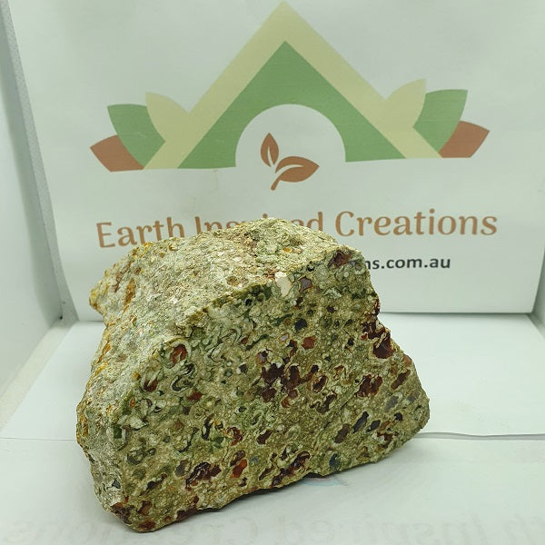 Rainforest Rhyolite is a rare type of rhyolitic lava. Gas bubbles are trapped in the lava flow which are later filled with agate, jasper and quartz, giving birth to this unique semi-precious stone.